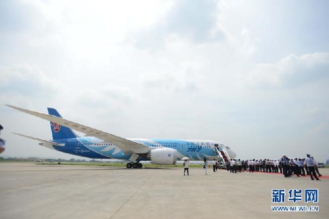 6月2日,南方航空公司在廣州白云機場(chǎng)舉辦接機儀式,宣布中國引進(jìn)的首架波音787夢(mèng)想飛機正式啟動(dòng)運營(yíng)。當日,我國引進(jìn)的首架波音787夢(mèng)想飛機飛抵廣州。 新華社記者 王建華 攝