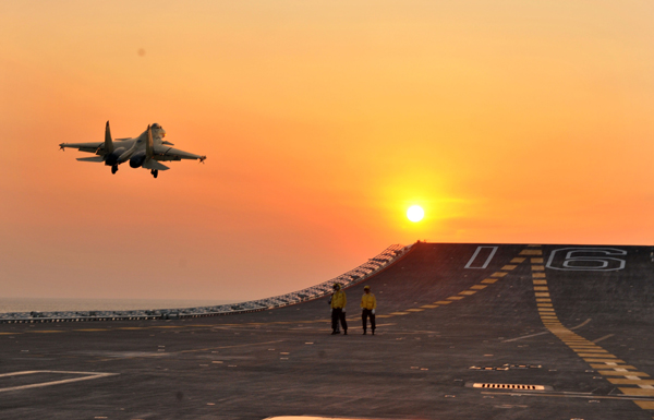 9月15日,殲—15艦載戰斗機成功完成最大重量起降試驗。圖為觸艦復飛的殲—15艦載戰斗機! 垊P攝