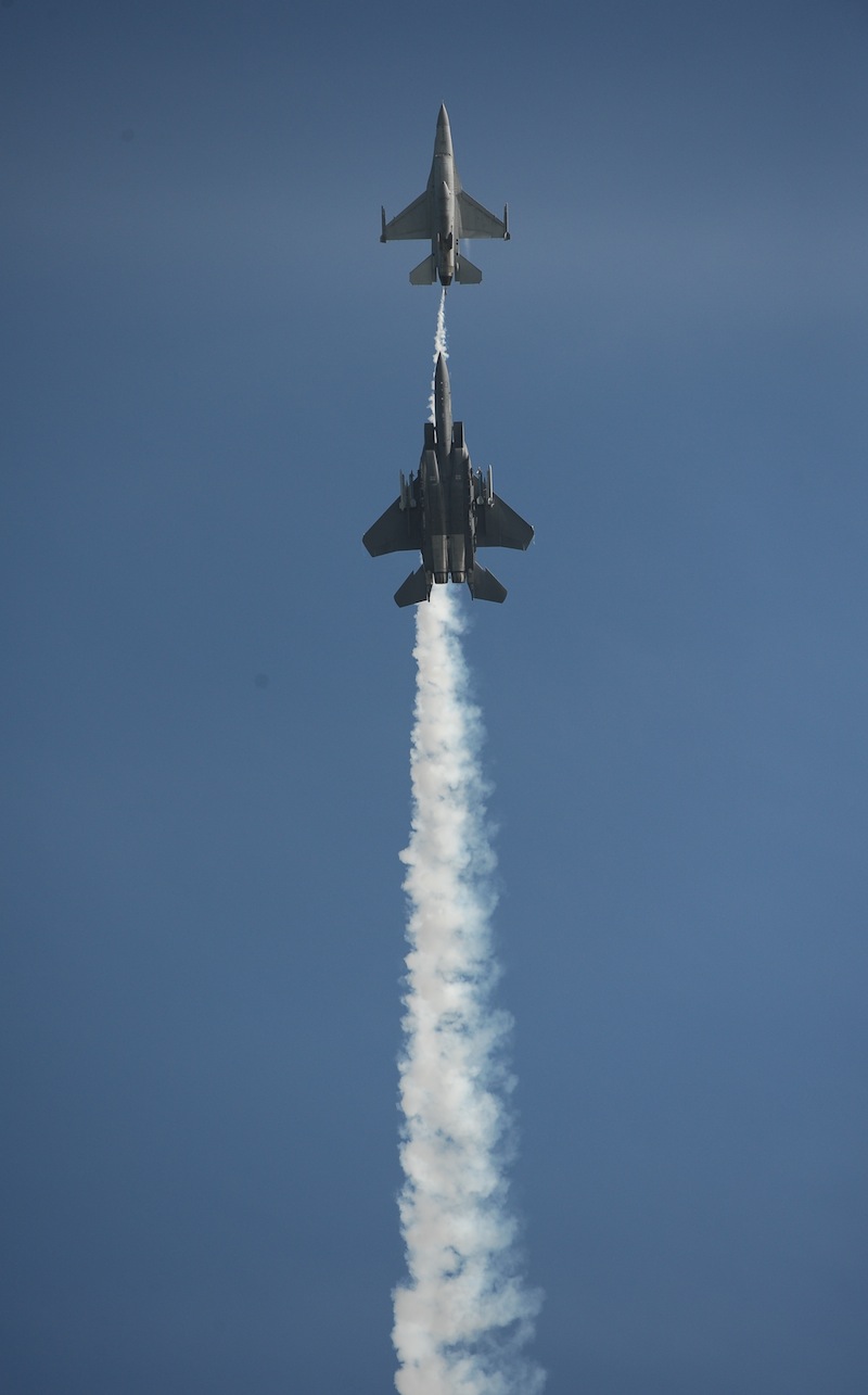2012年1月27日上午,新加坡空軍F-15SG戰機與F-16C戰機演練“咬尾飛行”。