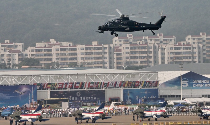 我國自主研制生產(chǎn)的武直-10武裝直升機亮相在珠海舉行的第九屆中國國際航空航天博覽會(huì ),在飛行表演中展示了這款直升機的優(yōu)良性能。