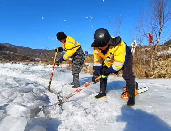 作業(yè)人員使用油鋸切開(kāi)河道內冰面,作為上游流水的引水槽。