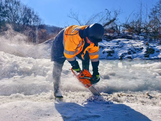 2月初的北方山區,寒風(fēng)呼嘯,風(fēng)力達五級,氣溫逼近零下20攝氏度。職工們手持油鋸、電鎬破開(kāi)冰層,由于橋下空間有限,職工們有時(shí)需要半跪或是半躺式,一層層的進(jìn)行破冰,然后再用鐵鍬將碎冰鏟至河道兩側。冰水混合物不斷濺到身上,迅速凝結成冰,不到半小時(shí),許多人外套已覆上一層白霜,成了名副其實(shí)的“冰人”。然而無(wú)人停歇,破冰動(dòng)作穩健而持續。