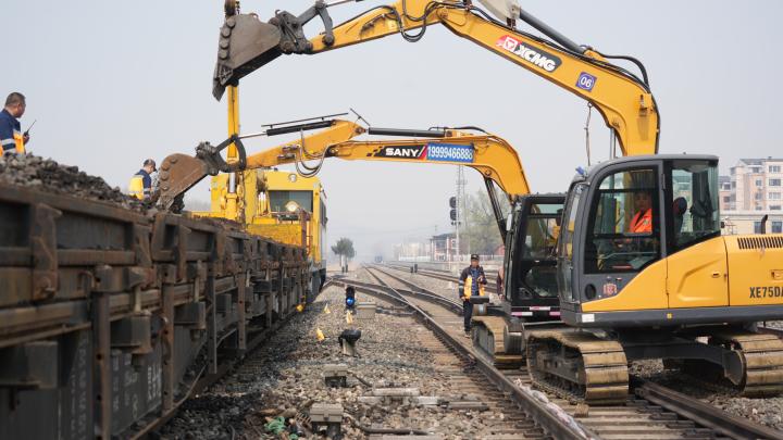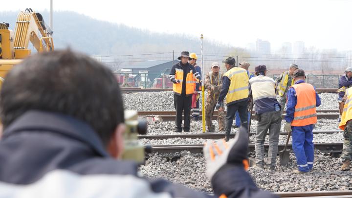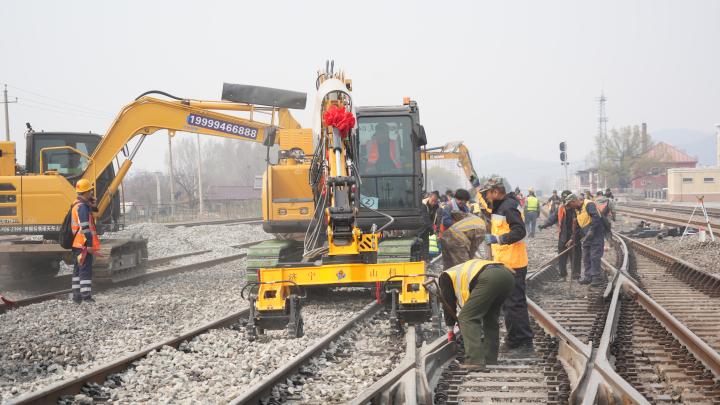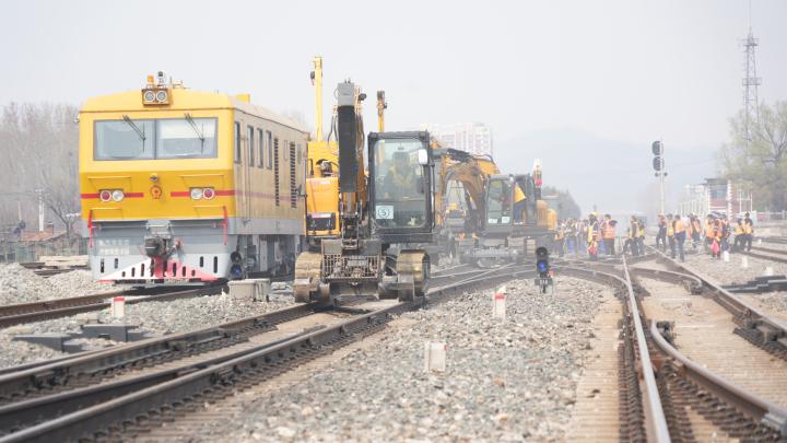 4月14日11時(shí)10分,在沈丹上行線(xiàn)石橋子站內22號道岔旁人頭攢動(dòng),機械轟鳴,循聲望去,一臺道岔清篩鉤機、一臺搗固鉤機以及三臺配備精細篩網(wǎng)的鉤機已按預定方案就位,與此同時(shí),來(lái)自丹東工務(wù)段石橋子線(xiàn)路車(chē)間70余名干部職工身著(zhù)黃色工作服,手拿撬棍、鐵鍬,在線(xiàn)路兩旁排隊等候施工命令的下達,一場(chǎng)以機械為主力、人工作業(yè)精準配合的道岔機械清篩施工即將有序展開(kāi)。