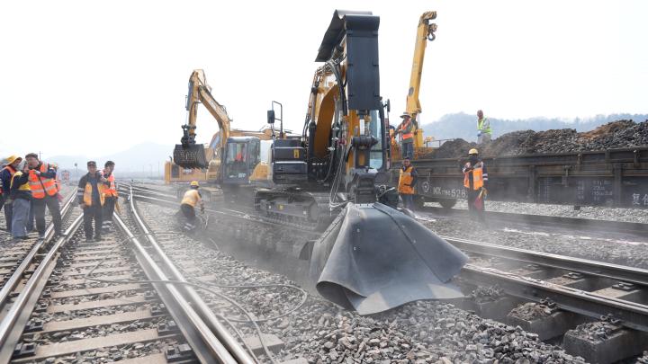 11時(shí)20分,隨著(zhù)施工命令下達,道岔清篩機率先啟動(dòng),巨大的挖掘鏈精準探入道岔關(guān)鍵區域,在現場(chǎng)作業(yè)人員的配合下,將臟污的道砟挖出并輸送至線(xiàn)路一側,再由帶篩網(wǎng)的鉤機將清理出的泥土廢砟清運到軌道車(chē)的平板上。