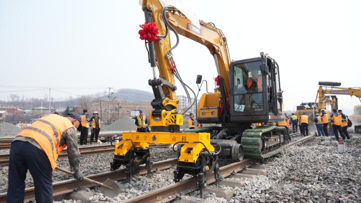 為縮短施工時(shí)間,提高施工進(jìn)度,12時(shí)30分,三臺鉤機相互配合回填石砟,搗固機隨即進(jìn)行精準搗固,快速恢復道床密實(shí)度與軌道幾何尺寸。