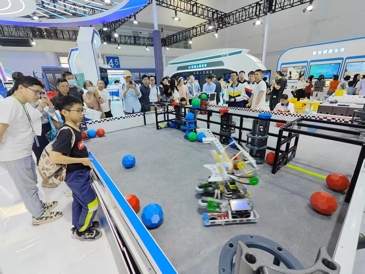 機器人籃球賽激烈開(kāi)賽,吸引“球迷”朋友們駐足觀(guān)賽。 中國經(jīng)濟網(wǎng)記者梁木攝
