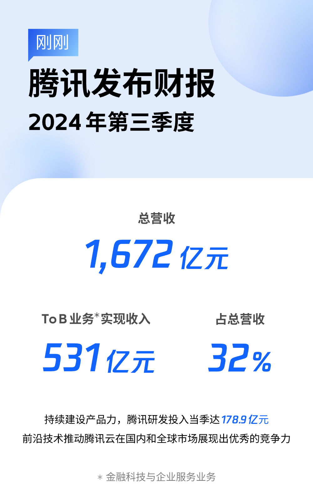 中國經(jīng)濟網(wǎng)北京11月14日訊(記者 李方) 11月13日,騰訊發(fā)布2024年Q3財報,當季度騰訊總營(yíng)收1672億元,同比增長(cháng)8%。騰訊ToB業(yè)務(wù)(金融科技及企業(yè)服務(wù))實(shí)現營(yíng)收531億元,占騰訊總營(yíng)收的32%。其中,企業(yè)服務(wù)的收入增長(cháng)受益于云服務(wù)和商家技術(shù)服務(wù)費推動(dòng),毛利受益于結構優(yōu)化、效率提升獲得顯著(zhù)增長(cháng)。