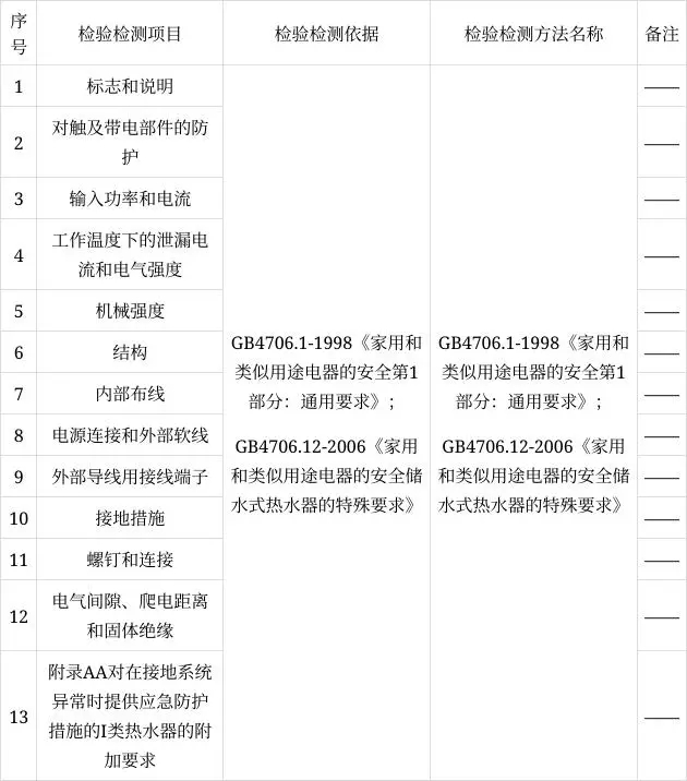 表2 儲水式電熱水器產(chǎn)品檢驗檢測項目及依據