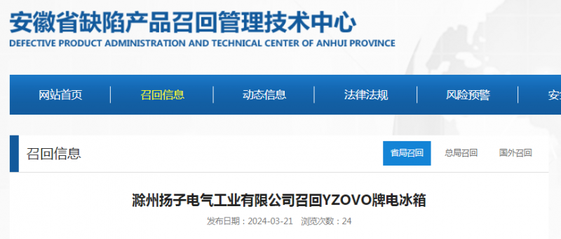 日前,滁州揚子電氣工業(yè)有限公司按照《消費品召回管理暫行規定》的要求,向安徽省市場(chǎng)監督管理局、滁州市市場(chǎng)監督管理局報告了召回計劃,將自即日起,召回2023年8月21日至2023年10月7日期間生產(chǎn)的YZOVO牌電冰箱(BCD-72P148),涉及數量為50臺。
