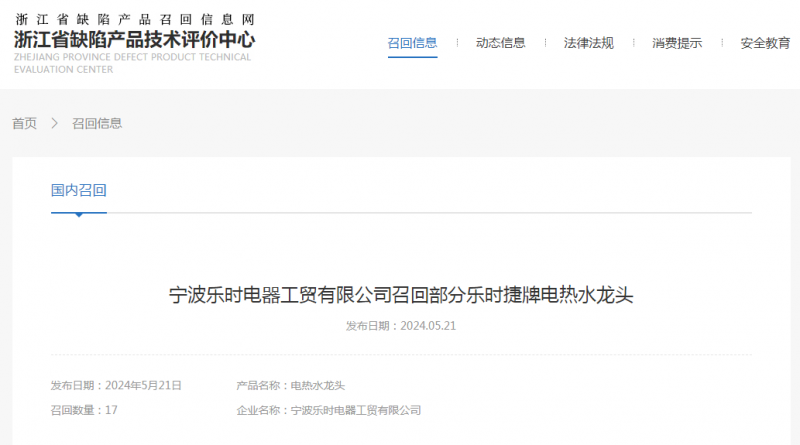 日前,寧波樂(lè )時(shí)電器工貿有限公司受缺陷調查影響按照《消費品召回管理暫行規定》的要求,主動(dòng)向浙江省市場(chǎng)監督管理局和寧波市市場(chǎng)監督管理局報告了召回計劃,將自即日起,召回2023年5月27日至2023年5月28日期間制造的樂(lè )時(shí)捷牌ST1X3型號電熱水龍頭,涉及數量為17件。