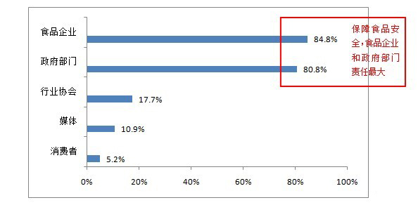在保障食品安全的責任問(wèn)題上,84.8%的市民認為食品企業(yè)責任最大,80.8%的市民認為政府部門(mén)責任最大,行業(yè)協(xié)會(huì )、媒體、消費者也被認為負有一定的責任,但比重較小,分別為17.7%、10.9%和5.2%。